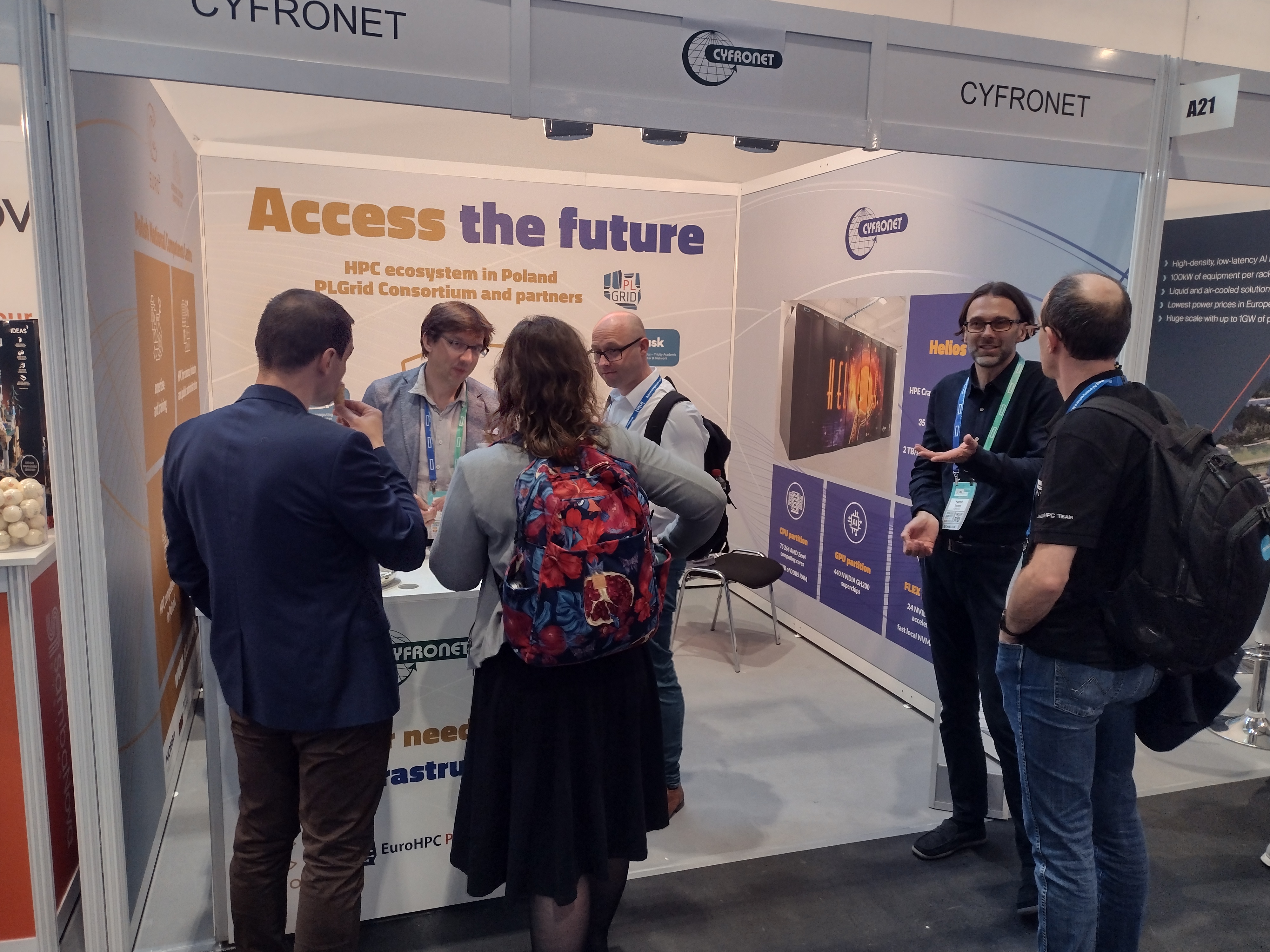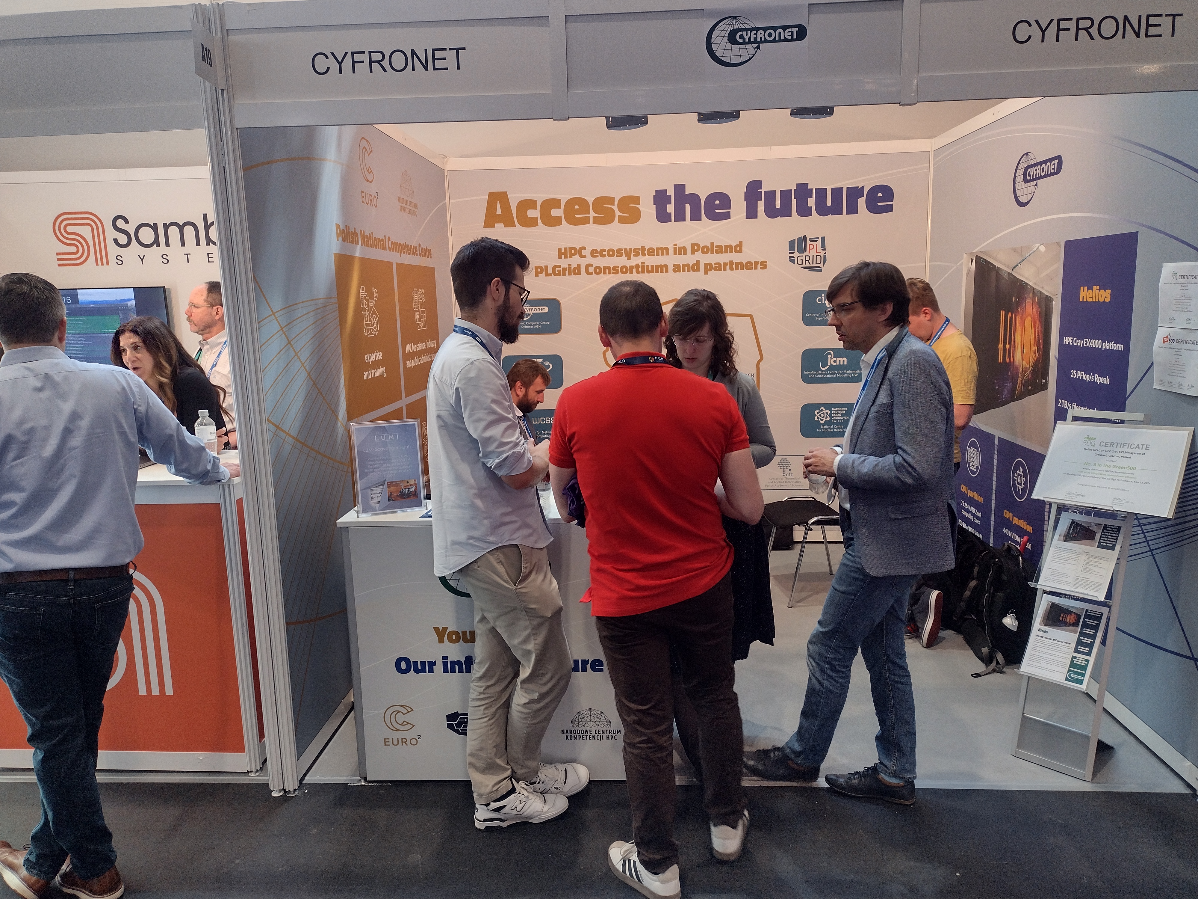 At the same time, Cyfronet appeared at ISC as an exhibitor for the fourth time, this time under the slogan "Access the future". Cyfronet's participation in ISC was, among others, related to promotional activities as part of the project: "National EuroHPC Competence Centers, phase 2". The information and promotional stand of ACC Cyfronet AGH was one of the few Polish accents during the fair. The exhibitors included both companies - technology giants such as Hewlett Packard Enterprise, Intel, and NVIDIA, as well as leading initiatives and supercomputing centers, including EuroHPC JU, LUMI, Jülich Supercomputing Center. In total, the fair included 160 exhibitors from 30 countries.